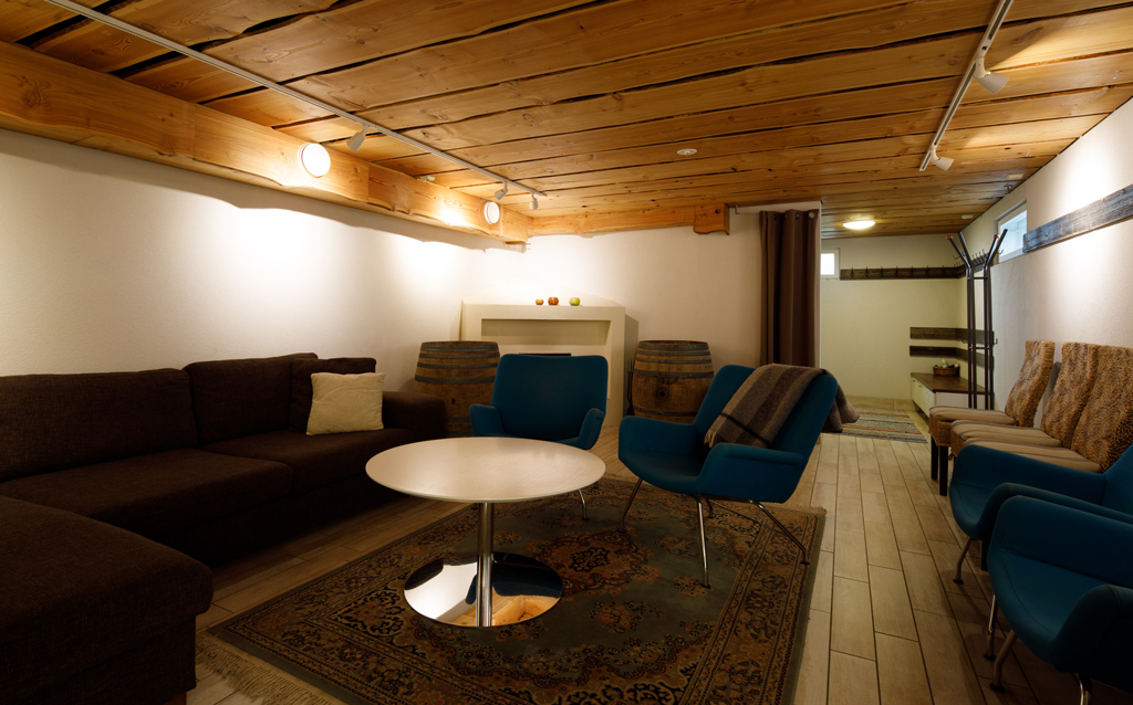 Alakerran voi verhoilla jakaa naisten ja miesten pukuhuoneeksi. Kummallekin joukolle jää runsaasti tilaa pukea ja peilailla. Viihtyisä takkahuone on ihanteellinen saunan jälkeiseen jäähdyttelyyn tai pidempiinkin illanistujaisiin.
