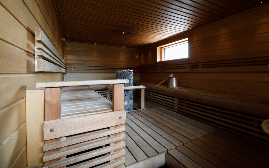 Sauna on tilava. Kiuas on keskellä ja lauteet kiertävät sitä. Palaverin voi aloittaa tai lopettaa saunassa tai sitten vain rentoutua. Suihkutiloissa on kolme suihkua ja erillinen wc.